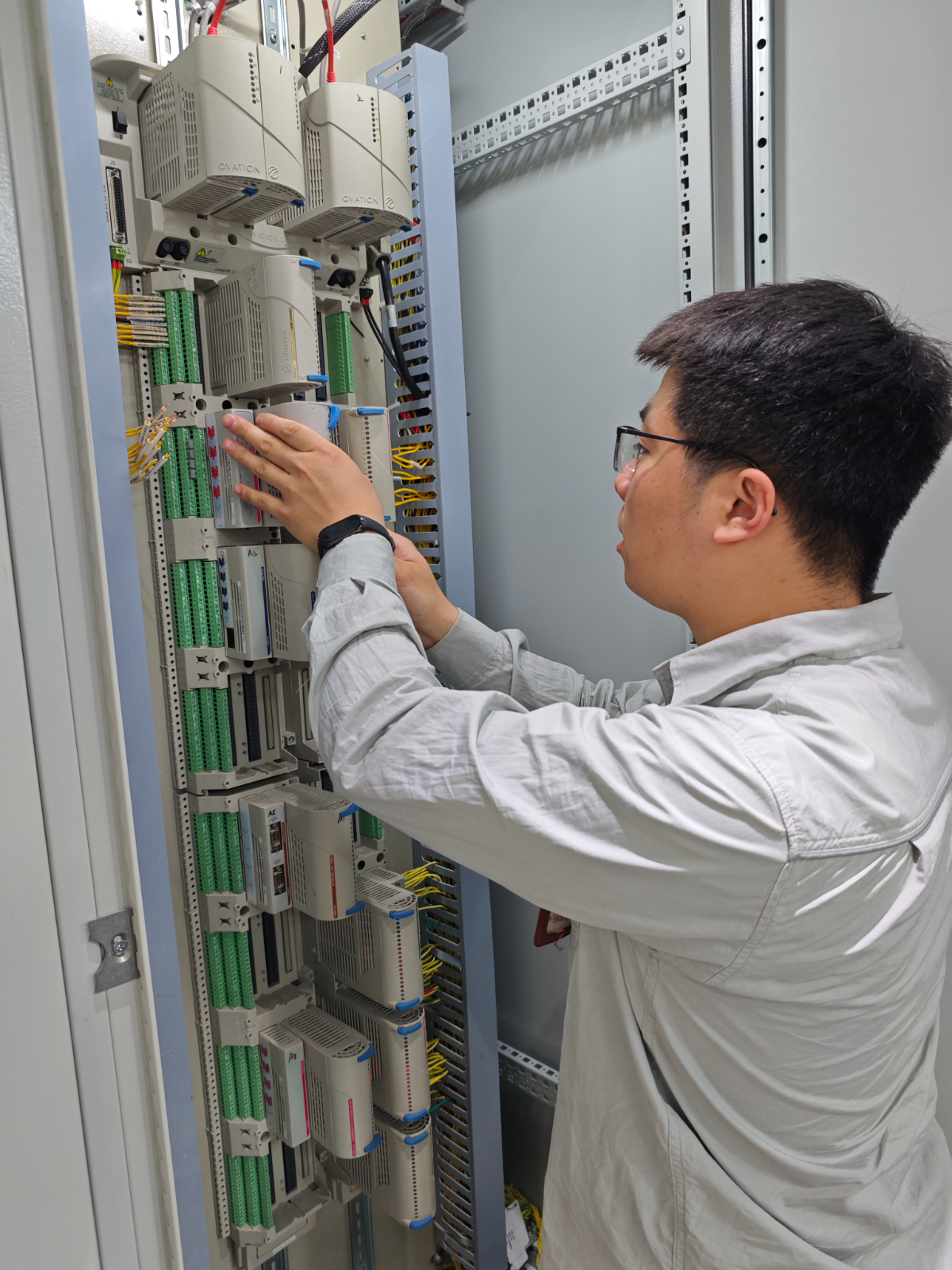 勁儀、短接線、電筆.......負責在電子室送信號的鐘佳源將所需的“裝備”有條不紊地從背包里拿出,胡遠亮則緊盯著卡件組態,對后續測試步驟進行梳理,做到心中有數。為較好還原樂電三期機組實際負荷接線方式,鐘佳源嚴格按照三期DEH卡件供電方式對備品卡件的通道接線送信號,勢必把精確度拿捏到位,確保萬無一失。