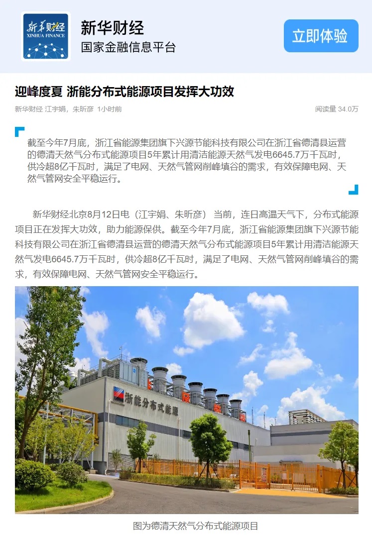 △8月12日,新華財經報道《迎峰度夏 浙能分布式能源項目發揮大功效》。