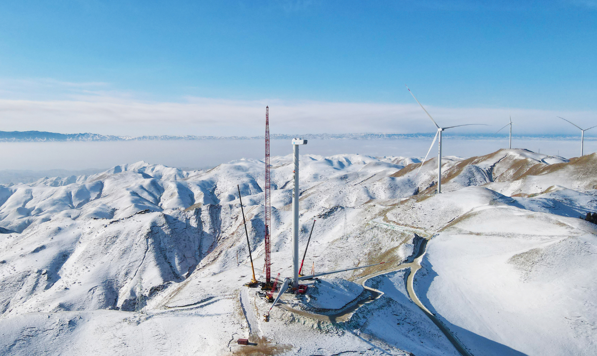 浙能景泰風電項目風機葉輪吊裝現場。 孟燕強 攝