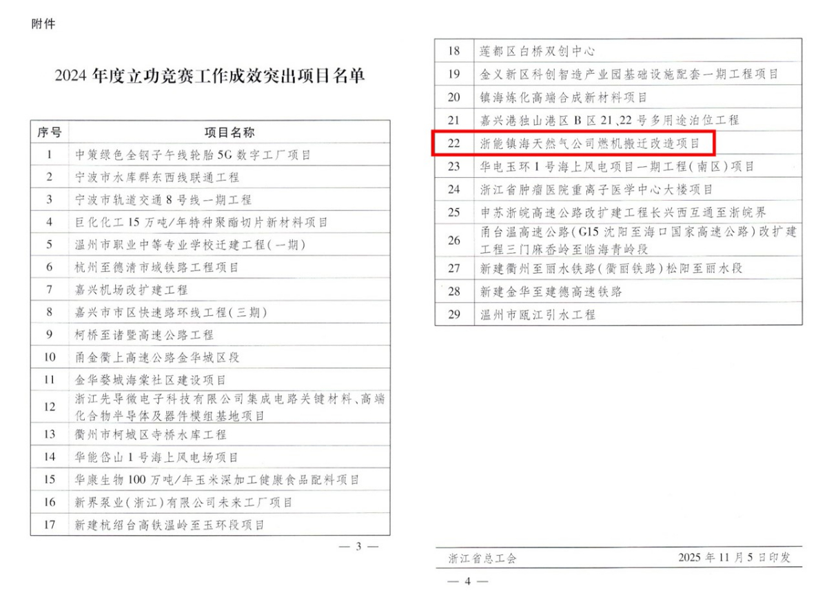 浙能鎮(zhèn)電燃機搬遷改造項目獲省級立功競賽工作成效突出項目