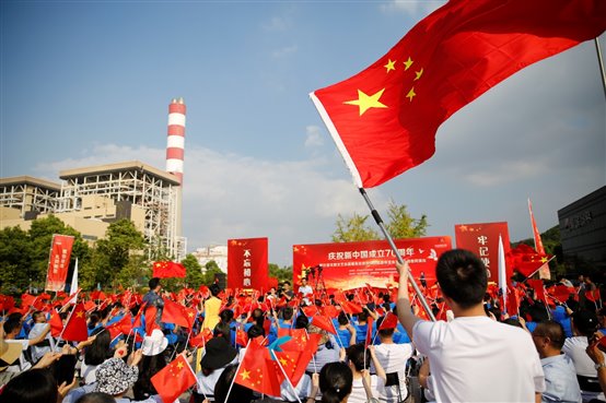 嘉華發(fā)電公司青年樂(lè)隊(duì)以一曲《我愛(ài)你中國(guó)》唱響浙能人的奮斗情、愛(ài)國(guó)心。此次文藝志愿活動(dòng)以“獻(xiàn)禮祖國(guó)”為主題,浙江省文聯(lián)組織國(guó)內(nèi)有影響力的各藝術(shù)門類的40多名藝術(shù)家,頂著烈日,獻(xiàn)上了歌曲、舞蹈、小品、雜技、魔術(shù)等精彩節(jié)目,展現(xiàn)了70年來(lái)國(guó)家和民族所發(fā)生的巨大變化,弘揚(yáng)愛(ài)國(guó)主義精神,謳歌人民幸福生活。演出現(xiàn)場(chǎng)氣氛熱烈,博得現(xiàn)場(chǎng)陣陣掌聲,職工們揮舞國(guó)旗、齊聲歡唱,不時(shí)拿起手機(jī)記錄和分享一個(gè)個(gè)精彩的演出瞬間。